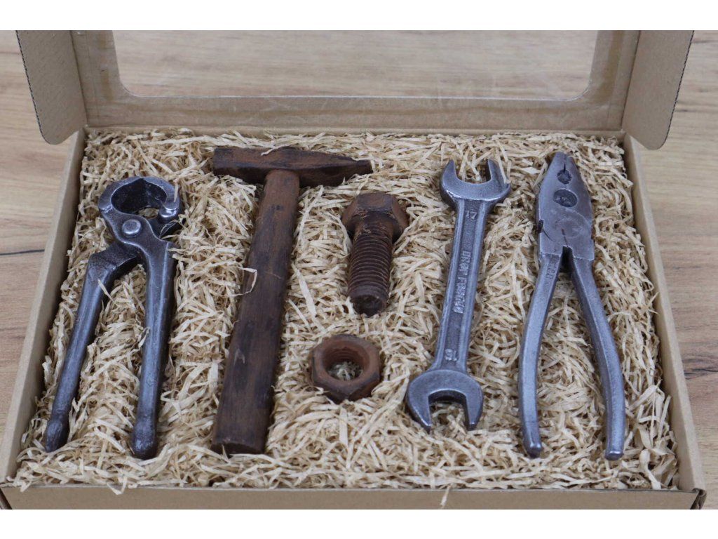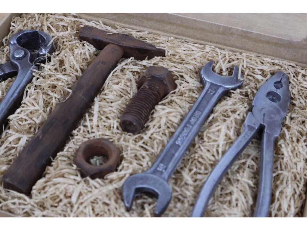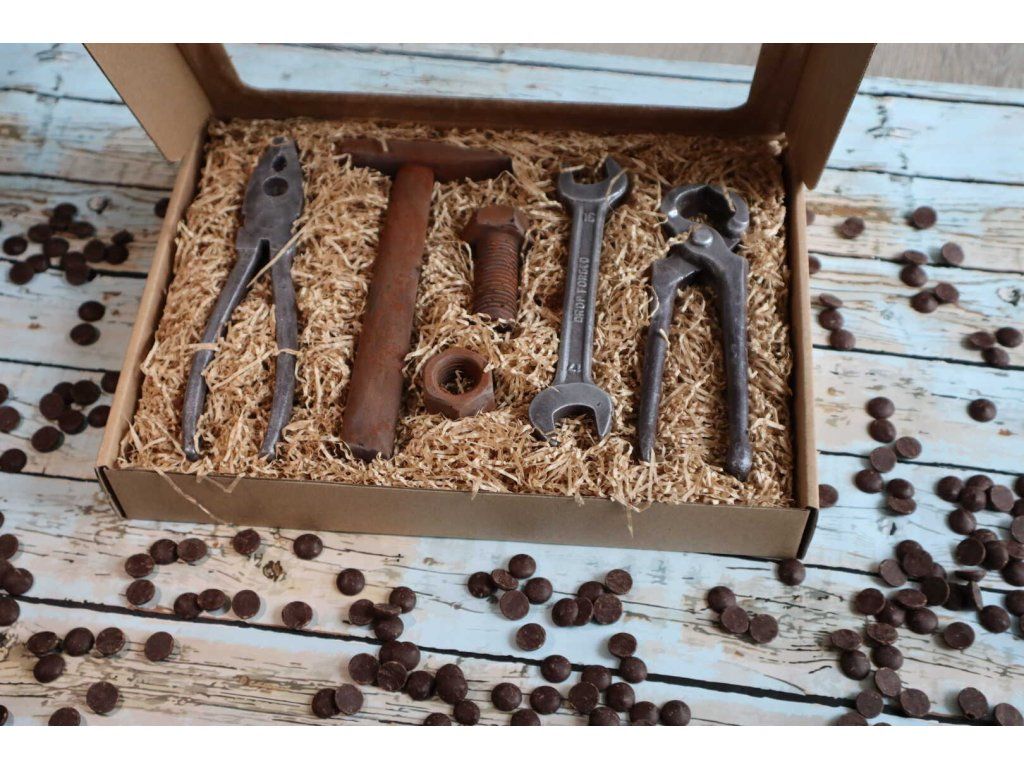 Ez a csokoládé szerszámkészlet mindent tartalmaz, ami minden otthoni ezermester műhelyébe tartozik. De ne használja ezeket munkára (foglalja le a szerszámokat, az ezermestert), hanem próbálja ki, milyen íze van a prémium Callebaut csokoládénak, amiből készültek.