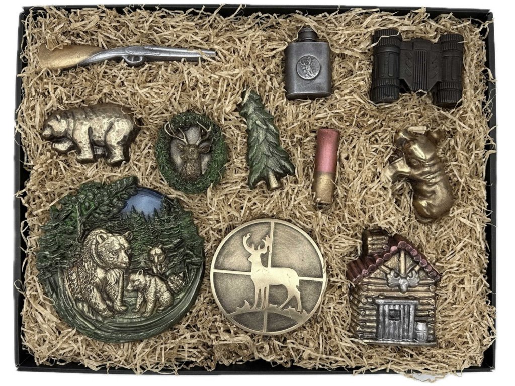 Csokoládé puska, Lőszer, Fa, Medve, Őz, Kutya, Kulacs, Házikó, Szarvas trófea, Medvék, Távcső